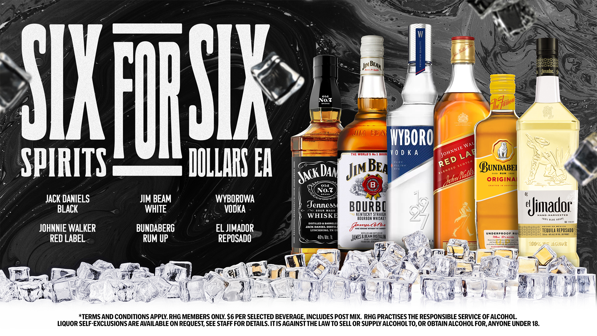 RHG Members can enjoy one of six selected spirits with post mix included for $6! 🍻